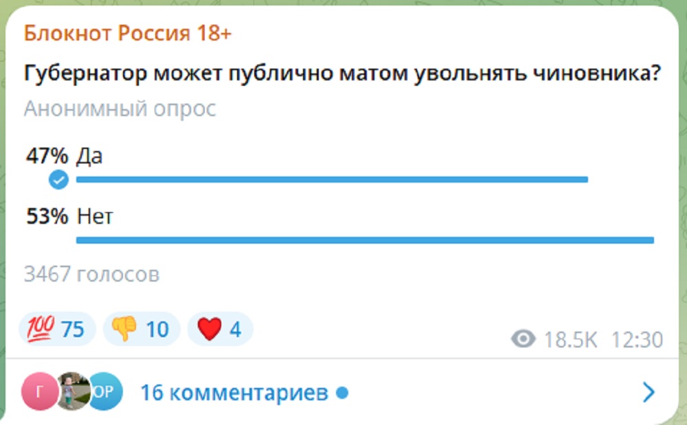 Он также напомнил, что в русской традиции мат всегда считался грехом, и что настоящий русский характер — это вера, достоинство и уважение, а не «эффектные» увольнения под камеру. Особенно блогера возмутило то, что пресс-служба губернатора выставила этот эпизод как «жёсткий, но справедливый поступок».