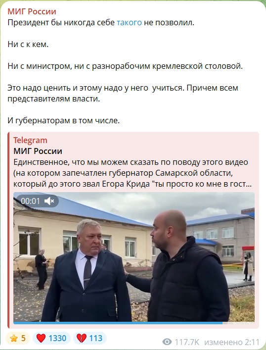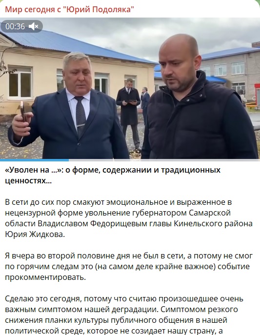 «Публичный МАТ, а в данном случае это не просто грубость и низкая культура. В данном случае его сознательно выпятила пресс-службой губернатора Самарской области, как его достоинство (иначе бы этот эпизод просто бы не попал в СМИ). И это уже новый уровень погружения (а не возвышения). Это не про ТРАДИЦИОННЫЕ ЦЕННОСТИ, а против них».