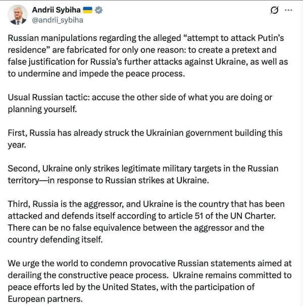 Украинский дипломат Андрей Сибига считает, что раз за 48 часов Москва не предоставила ни одного доказательства, значит, никакой атаки и не было, и все фейк.