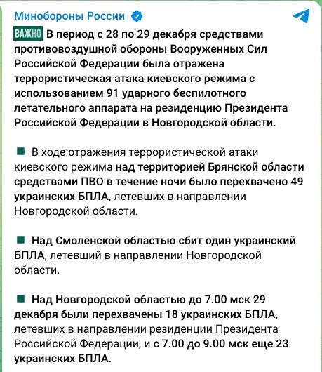 Министр иностранных дел России Сергей Лавров четко заявил, что Киев предпринял попутку атаки беспилотников на госрезиденцию президента РФ в Новгородской области. 91 украинский дрон был уничтожен. И еще указал на то, что после этого РФ определила объекты и время ответного удара. Более того, с учетом окончательного перехода Киева к политике государственного терроризма переговорная позиция России будет пересмотрена.