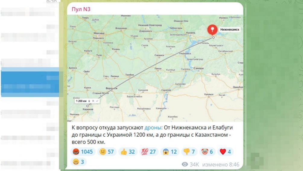 «К вопросу откуда запускают дроны: От Нижнекамска и Елабуги до границы с Украиной 1200 км, а до границы с Казахстаном — всего 500 км», — отмечает телеграм-канал «Пул N3». Тем не менее вопрос, откуда запустили дроны, остается открытым.