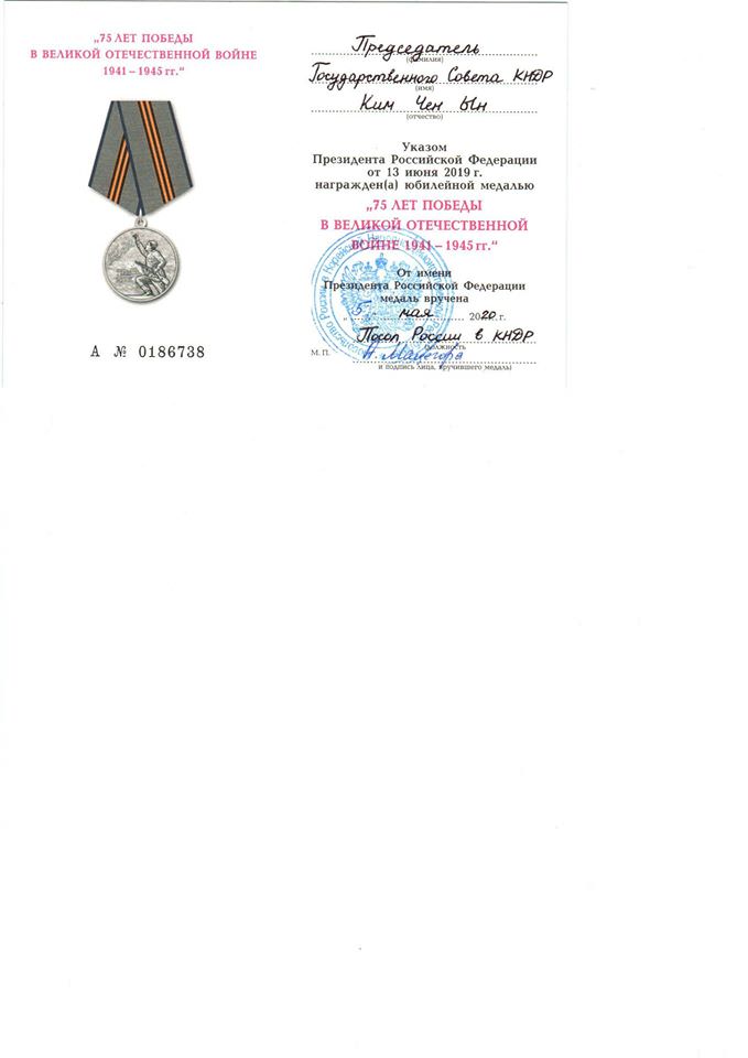 Лидер Северной Кореи Ким Чен Ын награжден юбилейной медалью "75 лет Победы в Великой Отечественной войне 1941-1945 гг." Президент Владимир Путин подписал указ о присуждении почетной награды главе КНДР.