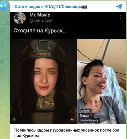 Ранее телеграм-канал «Фото и видео ЧП/ДТП/Очевидцы» опубликовал многоговорящее фото, на котором изображена украинская военнослужащая. На ней снимок украинки до и после ранения. «Сходила на Курск» - подписал автор фото. Сама военнослужащая обращается к маме: «Мамуся, выздоравливаю».
