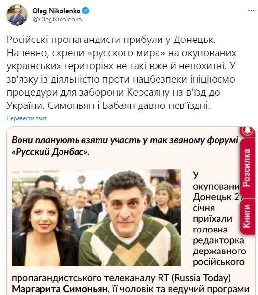 «Российские пропагандисты прибыли в Донецк. Наверное, скрепы «русского мира» на оккупированных украинских территориях не так уж и непоколебимы», — заявил дипломат. Он также сообщил, что МИД Украины инициирует запрет на въезд для Кеосаяна в связи с его «деятельностью против нацбезопасности» Украины. «Симоньян и Бабаян давно невъездные», — уточнил Николенко.