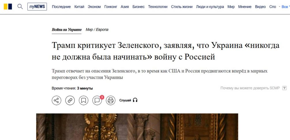 Так, South China Morning Post отмечает, что Трамп раскритиковал Зеленского за то, что тот мог бы и вовсе не начинать войну и предотвратить её на начальном этапе.
