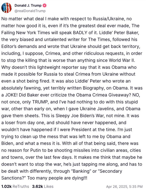 26 апреля президент США Дональд Трамп, после встречи с Зеленским на похоронах Папы Римского, разразился новым постом в своей социальной сети. В частности, Дональд сделал традиционный выпад в сторону прошлых президентов штатов, а также вновь назвал территориальные требования Украины нелепыми.