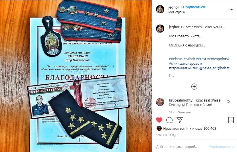 В соцсетях распространилось сообщение, что сегодня, 11 августа, капитан милиции Егор Емельянов добровольно ушел в отставку. "17 лет службы окончены. Моя совесть чиста. Милиция с народом, — написал экс-милиционер в Инстаграме.