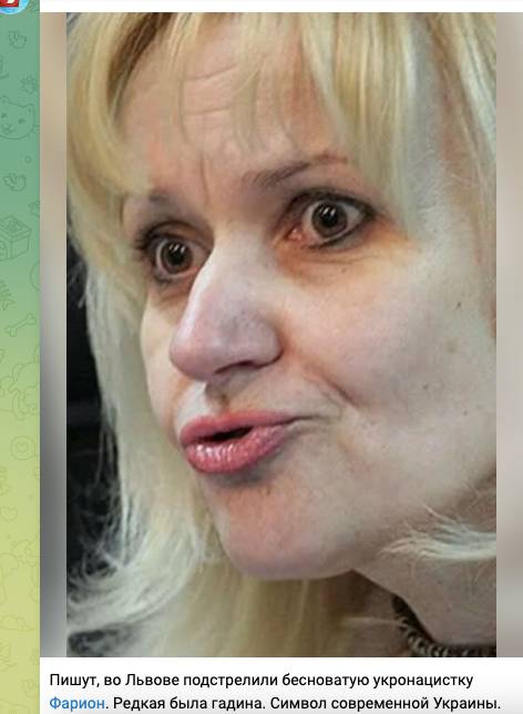 Никогда не скрывающая ненависти к русским по национальному признаку и ярая противница русского языка Ирина Фарион умерла на операционном столе после покушения накануне вечером в одной из больниц Львова. В смерти ярой русофобки нет русского следа: убрали свои же. При этом на Украине не сбрасывают со счетов и денежный вопрос. Уж слишком демонстративно все было проведено. Предполагаемый убийца - молодой человек призывного возраста, который несколько дней спокойно следил за ней, и это тогда, когда в поле зрения людоловов (так называет на Украине военкомов, которые отлавливают мужчин на улицах для принудительной мобилизации). А это значит, что он обладал особым документом и был неприкасаемой фигурой для сотрудников ТЦК. Но обо всем по порядку.