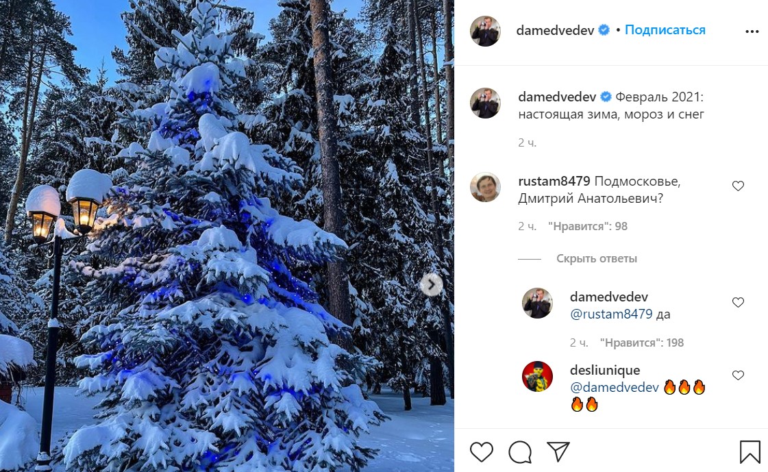 Но самым резонансным стал поступок бывшего главы правительства Дмитрия Медведева. Заядлый блогер выложил в Instagram пост с тремя фотографиями в галерее. И на каждом снимке можно увидеть горящие фонари. «Февраль 2021: настоящая зима, мороз и снег», - подписал фото политик.