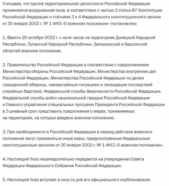 «Поэтому мной подписан Указ о введении военного положения в этих четырех субъектах Российской Федерации. Он незамедлительно будет направлен на утверждение в Совет Федерации. О принятом решении проинформирована и Государственная Дума», — сообщил президент.