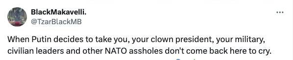 «Когда Путин решит забрать Украину, ваш клоун-президент, ваши военные, гражданские лидеры и прочие натовские придурки не вернуться в страну, чтобы поплакать над судьбой украинцев», - следует понимать комментарий одного из пользователей.