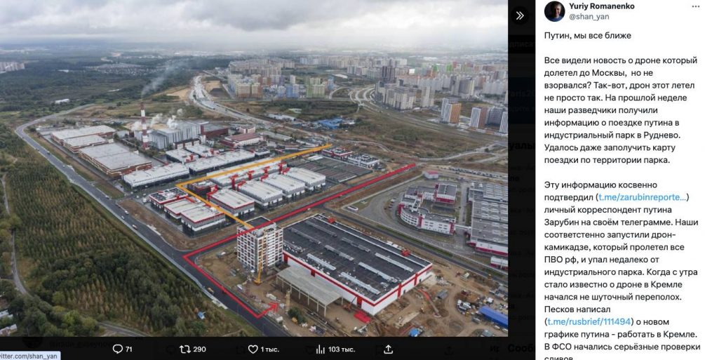 «Все видели новость о дроне который долетел до Москвы, но не взорвался? Так-вот, дрон этот летел не просто так. На прошлой неделе наши разведчики получили информацию о поездке Путина в индустриальный парк в Руднево. Удалось даже заполучить карту поездки по территории парка», — написал сразу же в соцсетях украинский политолог, эксперт по международной и внутренней политике, русофоб Юрий Романенко, который якобы имеет тесные связи со спецслужбами Украины.