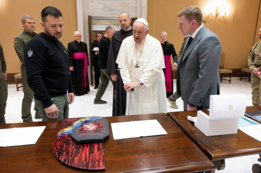 Издание также отмечает противоречие подарков, подаренных понтификом и Зеленским друг другу. Если Папа Римский подарил президенту Украины бронзовое изваяние оливковой ветви (символ мира) и свои документы о мире и братстве, то Зеленский преподнес в ответ оскорбительные иконы. Одна из них — образ Богородицы на пуленепробиваемой пластине на красном «кровавом» фоне и с полосами цветов украинского флага.