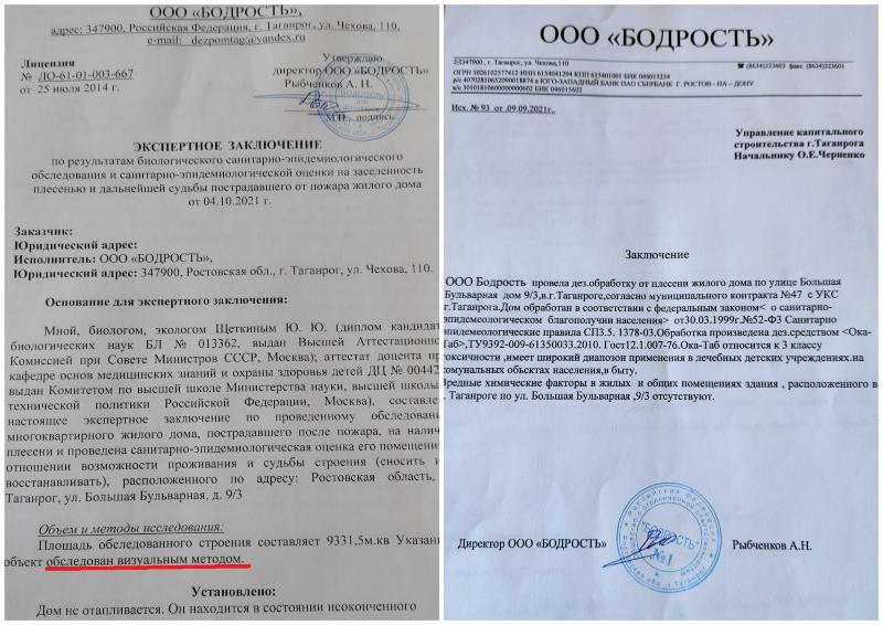 Но администрация Таганрога не признаёт свою вину. Они заказали экспертизу, а затем обработку от грибка, у местной компании ООО «Бодрость», которая вынесли вердикт, что с домом всё в порядке. На всё ушло более 600 тысяч. При этом в личной беседе ( снятой на видео) эксперт компании признала, что перекрытия между комнатами надо сносить. Ведь грибок и плесень снова появятся.