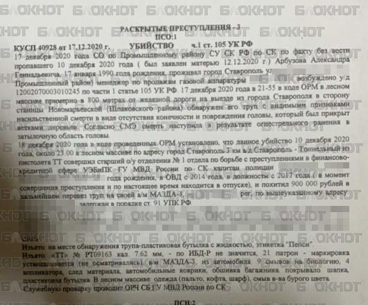Документ, оказавшийся у редакции «Блокнота», подтверждает, что жертвой убийства стал 29-летний Александр Арбузов.