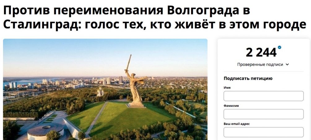 Сторонники возврата советского имени действуют через «Военный Совет Сталинградского Фронта», противники – создали петицию