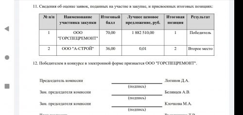 Победителем на конкурсе стало ООО «Горспецремонт». Организации достался тендер почти по максимальной допустимой стоимости. Компания набрала на торгах 70 баллов. При этом «А-Строю» с его копейкой комиссия дала лишь 36 баллов.