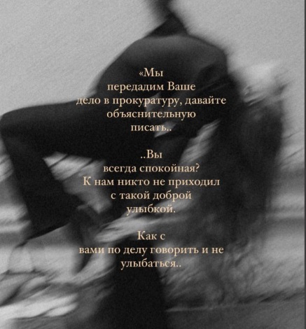 Мы передадим ваше дело в прокуратуру, давайте объяснительную писать. Вы всегда спокойная? К нам никто не приходил с такой доброй улыбкой, - вспоминает общение с сотрудником ФСБ блогерша.