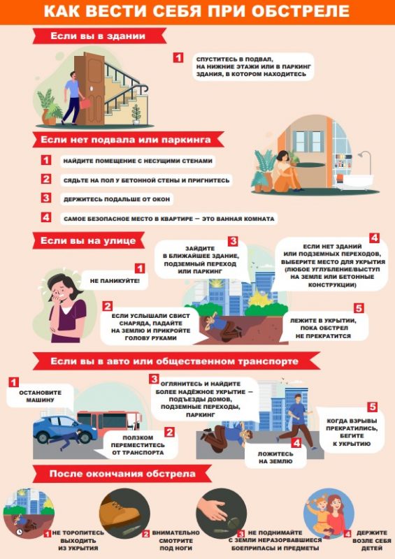 Инструкция с красочными картинками содержит алгоритм действий во время обстрела в нескольких ситуациях: если человек находится в здании, в здании без подвала и паркинга, на улице, в автобусе или машине.