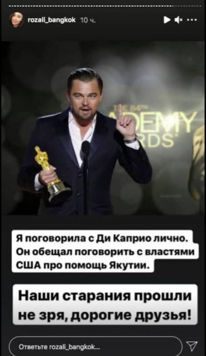 Девушка буквально забросала сообщениями актера. К ней подключились тысячи якутян, оставляя посты, отмечая актера во всех сторисах под хештегами #saveyakutia и #yakutiaonfire. И в итоге Зоя добилась своего. Ди Каприо обратил на нее внимание и пообещал экоактивистке поговорить с уполномоченными властями, чтобы понять, как и чем помочь.