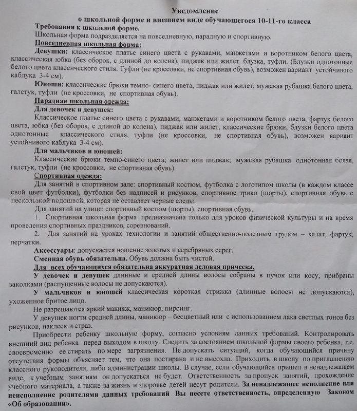 На запрос Елены администрация школы предоставила ей документ, в котором указываются требования к внешнему виду школьников при переводе в 10 класс. При этом о цвете волос в нем ничего не сказано. «Для всех обучающихся обязательная аккуратная деловая прическа, — говорится в документе. — У девочек и девушек длинные и средней длины волосы собраны в пучок или косу, прибраны заколками (распущенные волосы не допускаются)».