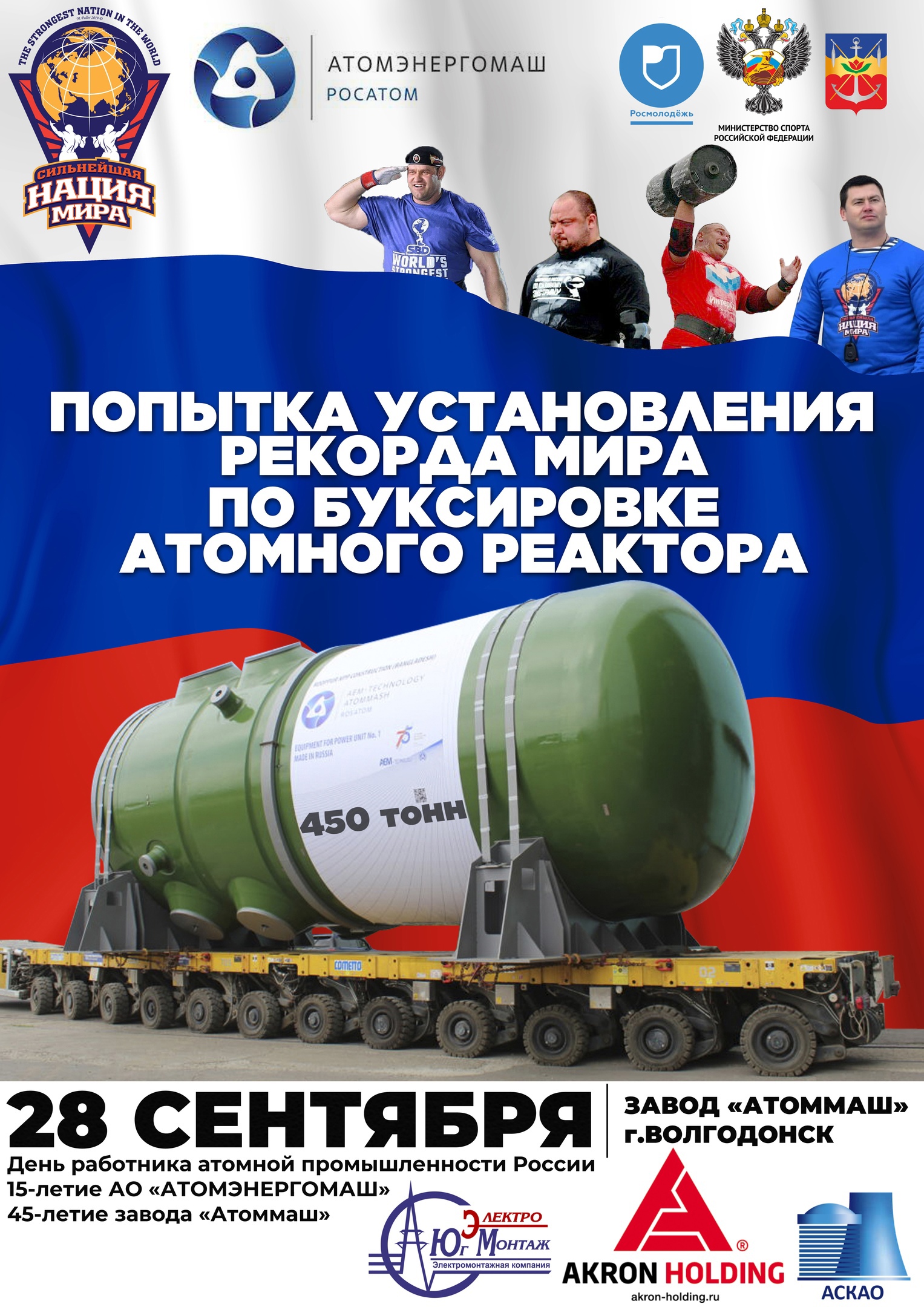 В Волгодонске на атомной электростанции «Атоммаш» 28 сентября запланирована попытка мирового рекорда, сообщает "Блокнот". Команда атлетов «Сильнейшая нация мира» попытается сдвинуть с места и переместить на самоходной тележке корпус атомного реактора общим весом 450 тонн.