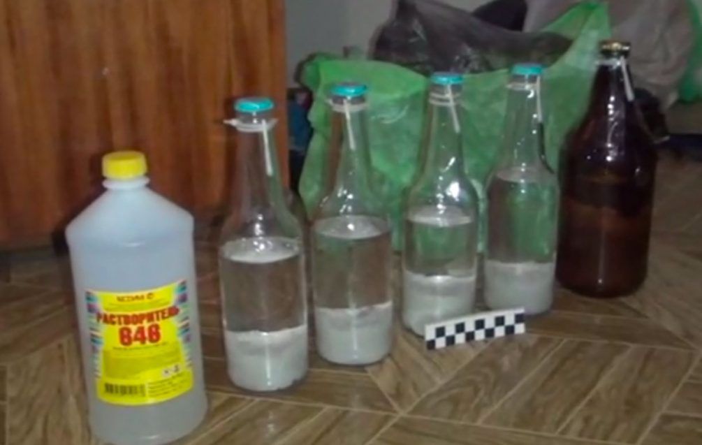 Задержанный подтвердил, что хотел бросить бутылку с зажигательной смесью в военкомат и убежать. Дома у подозреваемого была обнаружена бутылка бензина растворителя, пять готовых бутылок с зажигательной смесью и еще один растворитель 646.