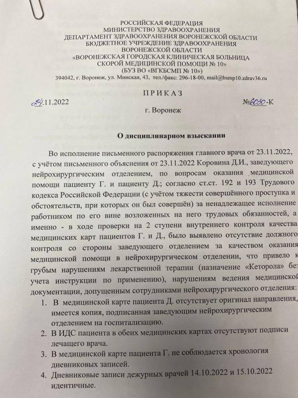 Вместо слов поддержки Дмитрий получил дисциплинарное взыскание с выговором от главного врача Воронежской городской клинической больницы скорой медицинской помощи №10 «Электроника» Михаила Иванова. Об этом сообщил "Блокнот Воронеж".