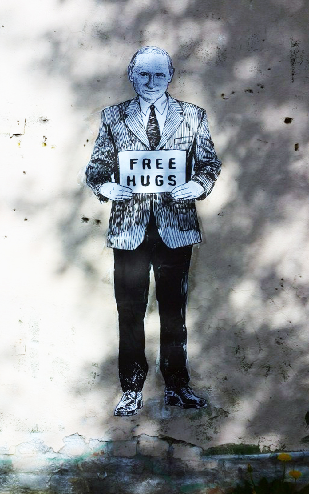 Прохожие обнаружили в Питере «Владимира Путина», предлагающего всем желающим бесплатные «обнимашки». На 10-й Красноармейской улице появились граффити, на которых запечатлен российский президент со знаменитой табличкой «FREE HUGS» в руках.