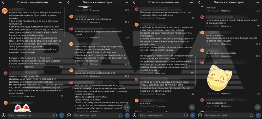 Драка и между девушками — четверокурсницей и юной первокурсницей — произошла 12 октября. Конфликт с топором стал кульминацией долгой перебранки в интернете: 17-летняя ученица первого курса обвинила другую в краже аккаунта.