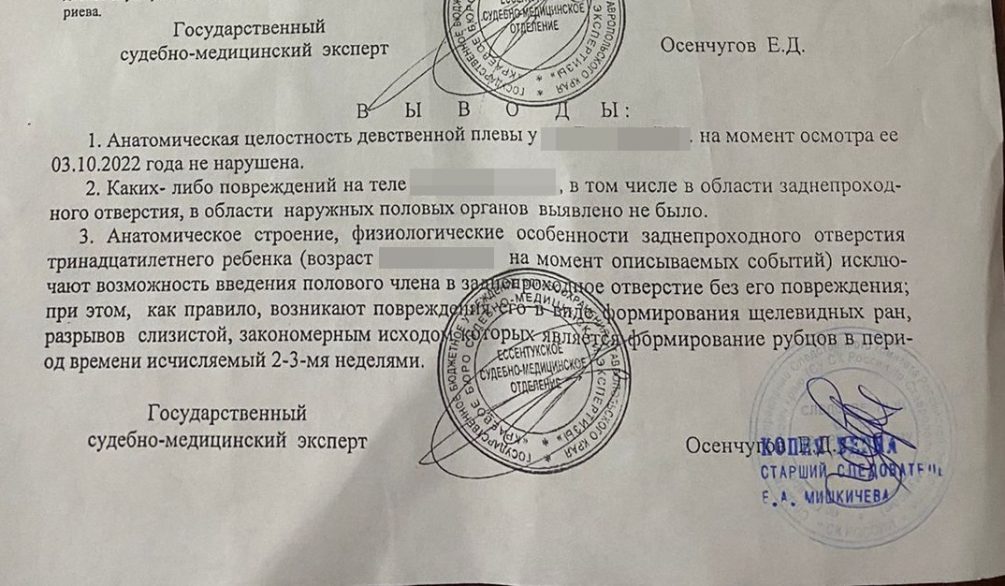 «Анатомическая целостность девственной плевы на момент осмотра 03.10.2022 года не нарушена, - делает выводы обследования государственный судебно-медицинский эксперт Осенчуков Е.Д. - Каких-либо повреждений на теле, в том числе в области заднепроходного отверстия, в области наружных половых органов выявлено не было. Анатомическое строение, физиологические особенности заднепроходного отверстия тринадцатилетнего ребенка (возраст на момент описываемых событий) исключают возможность введения полового члена в заднепроходное отверстие без его повреждения; при этом, как правило, возникают повреждения в виде формирования щелевидных ран, разрывов слизистой, закономерным исходом которых является формирование рубцов в период времени исчисляемый 2-3 неделями».