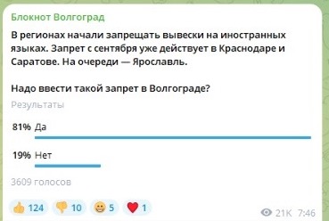 Региональная редакция «Блокнот» также провела опрос в своем telegram-канале и выяснила, что 81% опрошенных волгоградцев поддерживают введение запрета на иностранные вывески, тогда как 19% были против. В голосовании приняли участие почти 4000 человек.