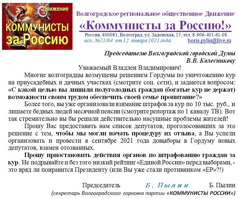 - Я отправил письмо в Волгоградскую городскую думу. Скоро узнаем, кто голосовал за уничтожение кур и штрафы для жителей. Давайте вместе определяться, кого из этих депутатов будем отзывать? – поделился лидер местных коммунистов России Борис Пылин. - Процедура отзыва сложная, но законная! По каждому округу, а их всего 18, надо будет создать инициативные группы и собрать подписи избирателей за отзыв. Избранных по партийным спискам отозвать не сможем, а их ещё 18. Кто готов включиться в эту работу, - пишите хоть открыто, хоть в личку.