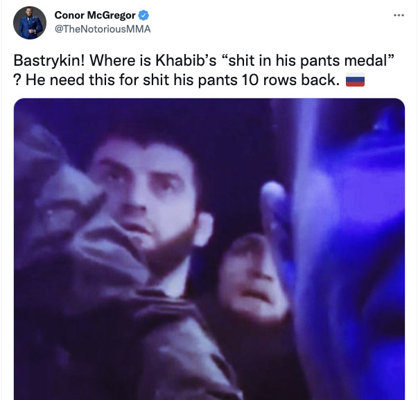 Кстати Макгрегор не остался в долгу. Он выложил ответный пост, в котором написал: «Бастрыкин! Где медаль Хабиба »За обоср*нные штаны«? Он заслужил ее, обделавшись в 10-м ряду».