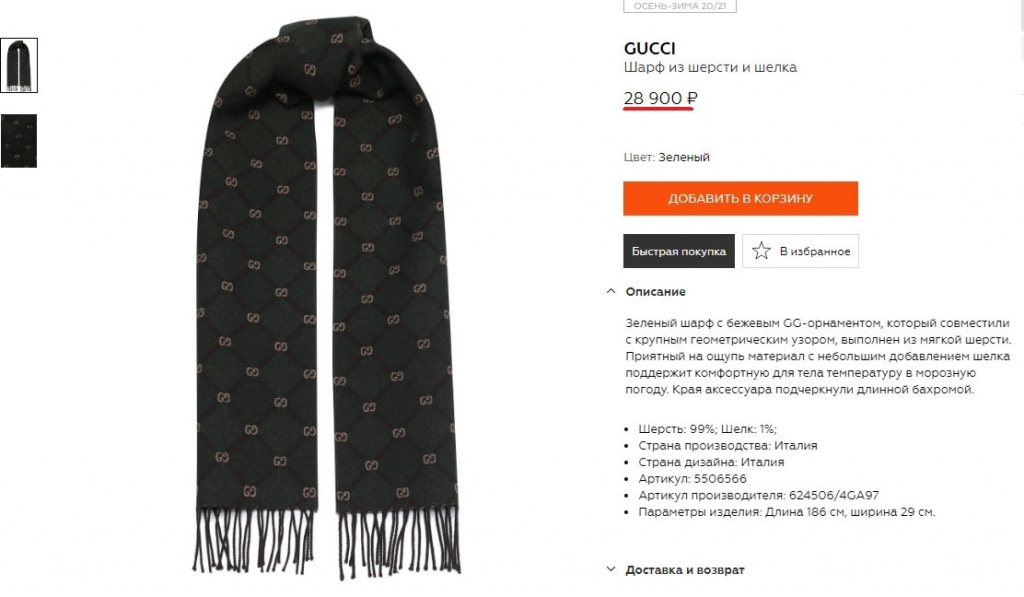 Так, на встречу с журналистами по поводу завершения работ в парке Собино, Алексей Логвиненко пришел в шарфике с логотипами бренда Gucci. На сайте ЦУМа такой стоил около 30 тысяч рублей.