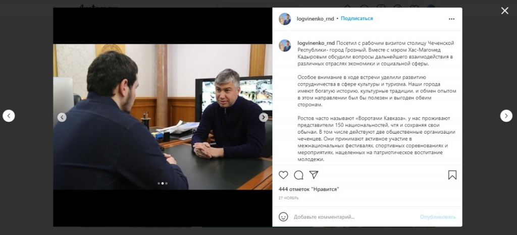 Сити-менеджер Ростова Алексей Логвиненко нанес визит в мэрию Грозного, чтобы обсудить с мэром города Хас-Магомедом Кадыровым вопросы дальнейшего взаимодействия. На видеозаписи и фотографиях на официальном сайте мэрии Грозного мэр Ростова сидит в дорогих часах.
