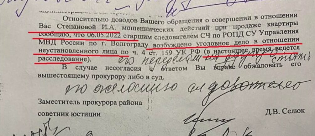 Женщина так и не смогла вернуть свои 1 миллион 700 тысяч рублей за купленную квартиру. Согласно решению Ворошиловского районного суда, семья Степановых должна была вернуть ей деньги за квартиру. Однако сроки возврата суд почему-то обозначил только устно. Спустя некоторое время пенсионерка была выселена из квартиры на улице Калинина судебными приставами.