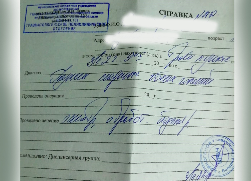 Покусанная Надежда предоставила документ из травмпункта, в котором указано «Травмы обеих голеней». Прямо из больницы женщина отправилась в городскую администрацию, но там заявление не приняли, а отправили в территориальный отдел. Там обращение приняли, сказав, что ответят в течение месяца.