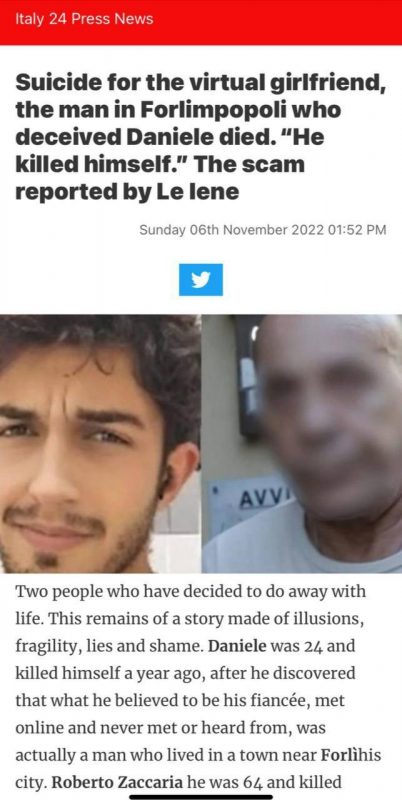 Следом за ним совершил суицид и сам поддельный возлюбленный. Об этом стало известно из сюжета итальянского шоу Le lene.