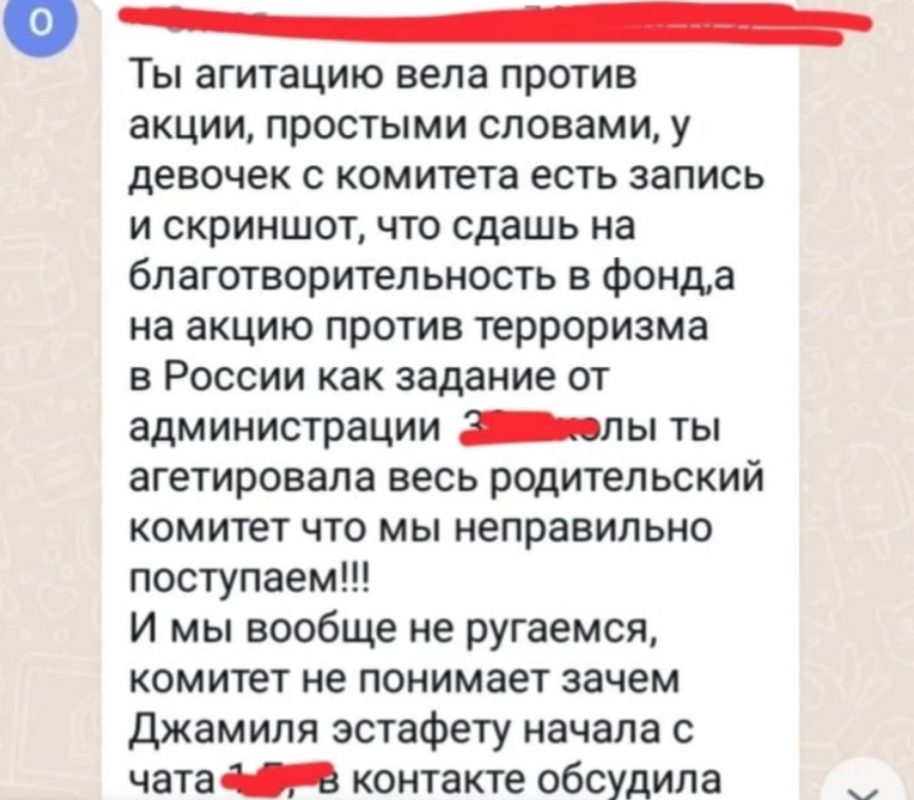 «Все факты, представленные в данной статье искажены. Никто не пытался оказывать давление на Саблину Джамилю, и тем более, манипулировать ею, - пишет Анна. - Никто из родителей не угрожал ей, не называл диссидентом и не устраивал кибератак. Сбор денег на акцию - инициатива исключительно родительского комитета. Отчёт о расходовании средств на родительском собрании был предоставлен и вопросов ни у кого не вызвал. Учитель к сбору средств никакого отношения не имела. Обвинения учителя в профнепригодности, тоже совершенно не обоснованы. Дети учителя любят. Родители на родительском собрании вручили учителю Благодарность».