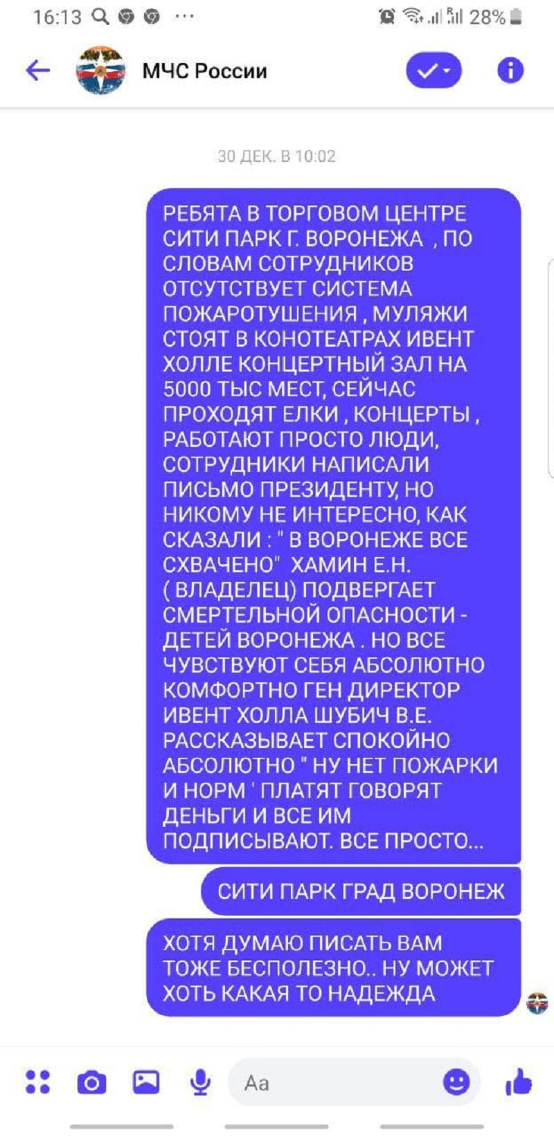 – Когда я услышала эту информацию (прим. о неработающей системе пожаротушения), я стала спрашивать у сотрудников торгового центра, которые давно работают. Они говорят: «Да, в марте 2020 приходили из МЧС, так мы тут бегали все, муляжи клеили», – рассказывает Оксана Пятницына. – А когда МЧСники пришли проверять шахты дымоудаления при помощи бумаги, то она даже не шевелилась. В это время приходит приказ о прекращении проверок – началась пандемия. Ребята (прим. сотрудники «Града») очень боятся писать сами. Они боятся Хамина, потому что думают, что все «куплено», все мстительные и на работу никуда в Воронеже не устроятся, так как их сразу уволят, а у всех семьи, дети .