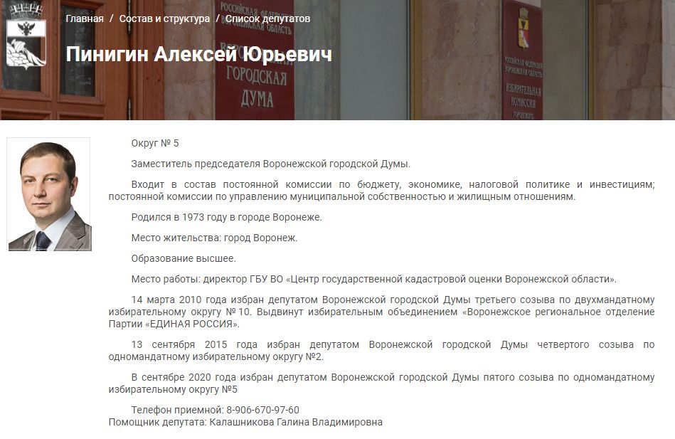 Однако в итоге стороны расстались. Пинигин перешел на работу исполнительным директором воронежского ООО «Профи-С». Потом возглавлял ООО «Портал». Наконец, последнее место работы Алексея Юрьевича – это руководство в Центре государственной кадастровой оценки Воронежской области.