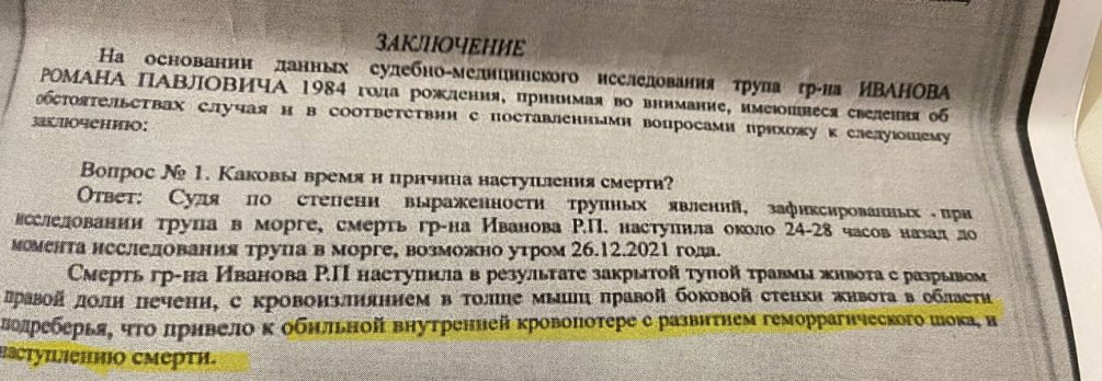 Татьяна Слащева показала результаты судебно-медицинского исследования, согласно которым причиной смерти является закрытая травма живота с повреждением печени, контакт с тупым предметом, из-за которого произошло обильное внутреннее кровотечение.