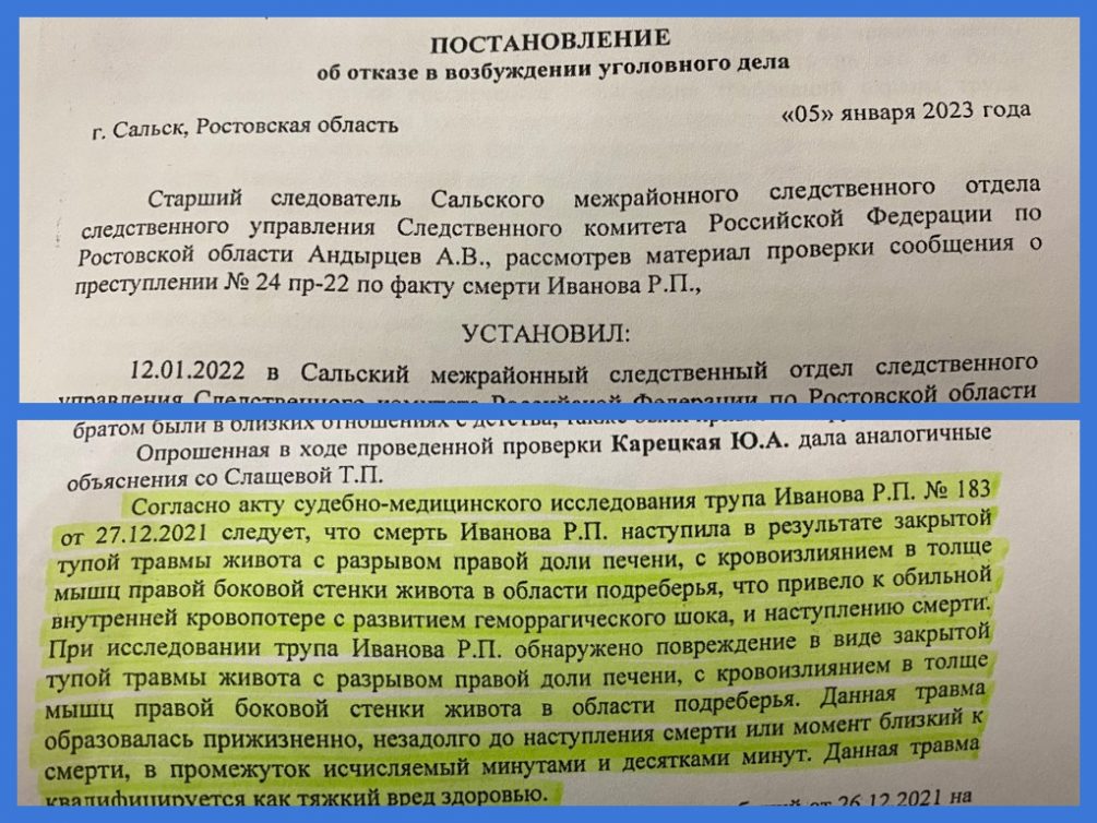 В Ростовской области мужчина получил мощный удар в живот, что стало причиной смерти. Но местный следственный отдел отказывается возбуждать уголовное дело.