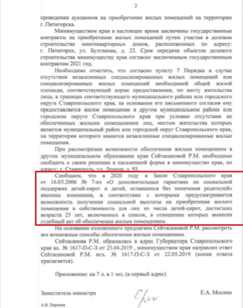 Однако из ведомства пришел ответ, подписанный замминистра, в котором сообщалось, что в Пятигорске свободного жилья для сирот нет.