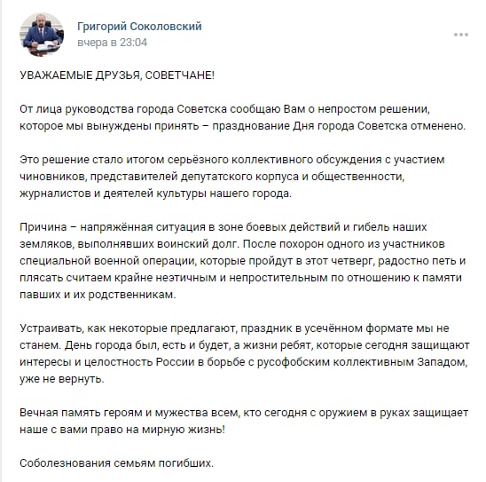 Как и в Ростове, в городе Советск Калининградской области отменили День города - празднования были намечены на 17 сентября. Причиной стала «напряженная ситуация в зоне боевых действий» на Украине, объявил мэр Григорий Соколовский. Решение было принято совместно администрацией города и местными депутатами.