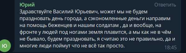 «Считаю, что в период специальной военной операции, с учётом того, что наш регион является приграничным, проведение любых массовых увеселительных мероприятий, таких как День города, запланированный на 17.09.2022 года, нецелесообразным. Поэтому прошу рассмотреть вопрос об отмене праздника, либо существенном сокращении запланированных мероприятий», – сказал Рымарь.
