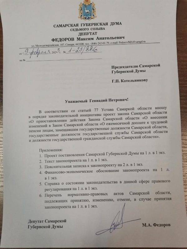 «Внёс сегодня законопроект в Самарскую Губернскую Думу о приостановке ежемесячных пенсионных выплат Самарским чиновникам из бюджета Самарской области до окончания СВО и направлению высвободившихся средств на нужды семей мобилизованных», – написал Максим Фёдоров в своём телеграм-канале вчера.