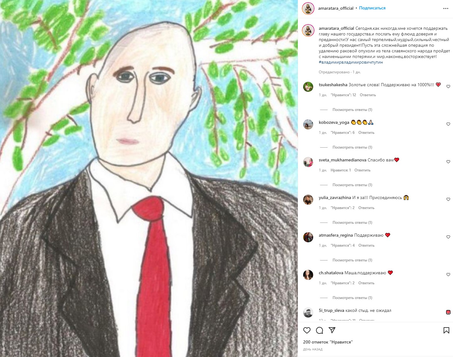 Вечером воскресенья, 27 февраля, она написала пост в Инстаграм, сравнив спецоперацию на Украине с удалением раковой опухоли и послала президенту России Владимиру Путину «флюид доверия и преданности».