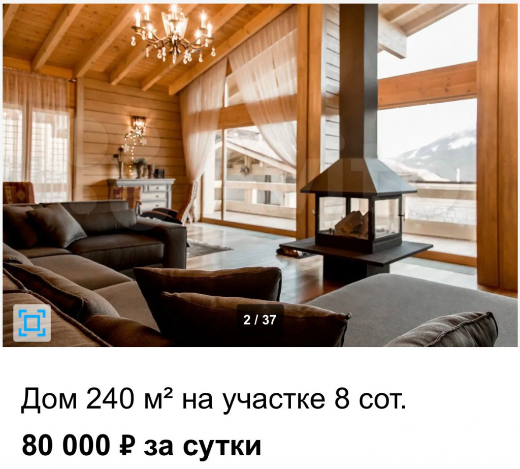 Можно отыскать и более бюджетный вариант размещения. Например дом в 240 квадратных метров за 80 тысяч рублей в сутки. Объект построен в 2020 году и имеет панорамные виды на горные массивы. По словам владельца, место очень уютное, имеется просторная гостиная с камином. Также на территории есть баня с бассейном.